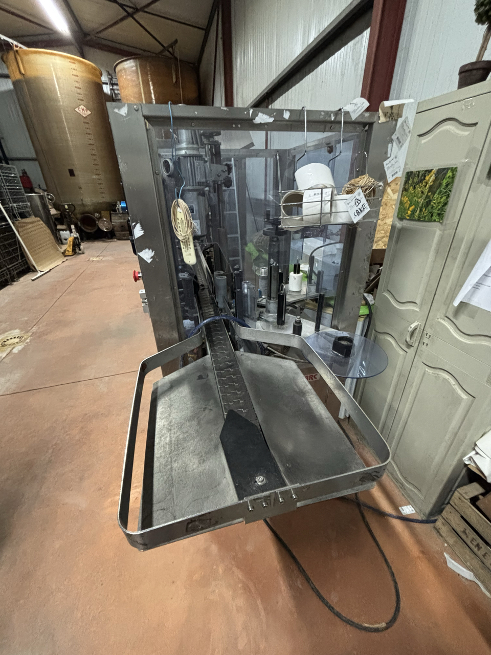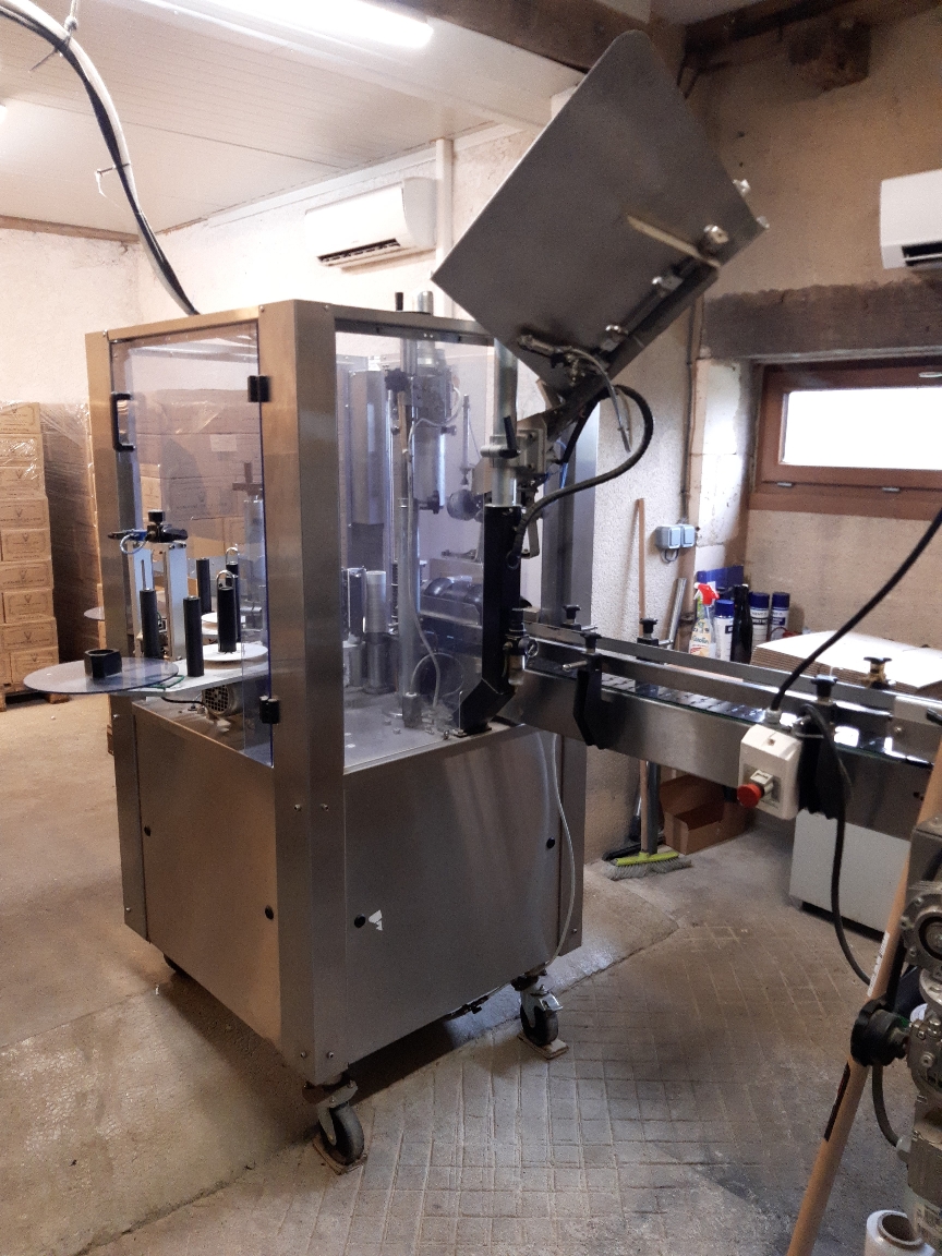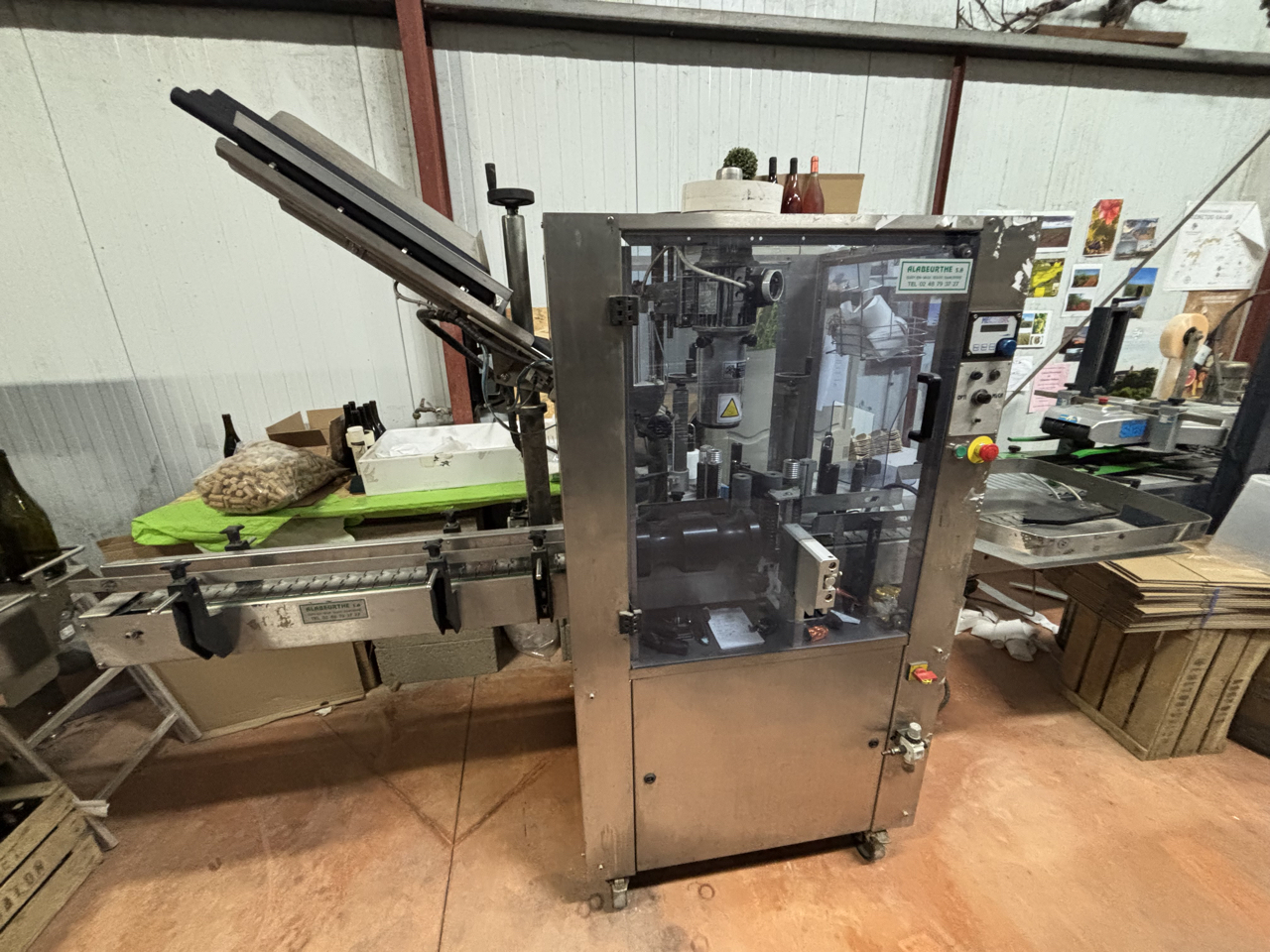 Distributeur capsules , double sertissage avec 2 sertisseuses CDA, pose étiquette , contre-étiquette et collerette. Gestion automatique du flux de bouteilles avec cellule à l'entrée et sortie.