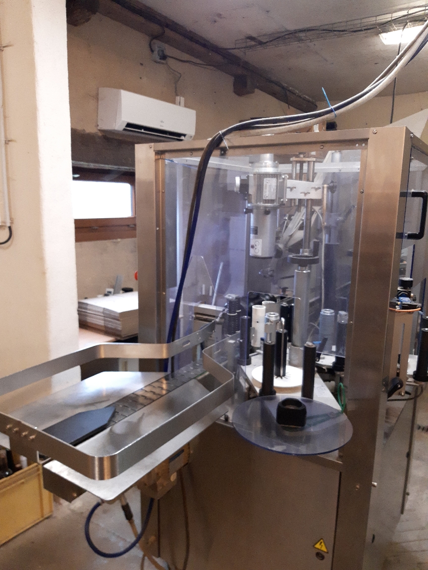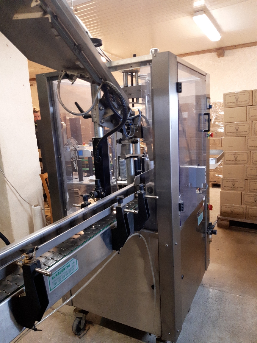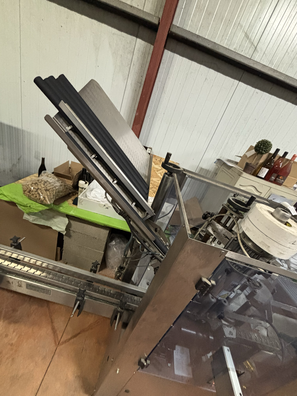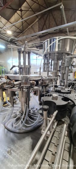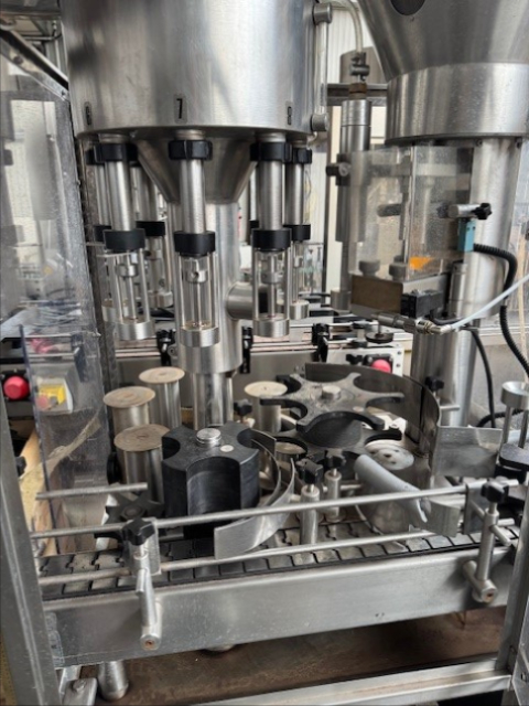 Distributeur capsules , double sertissage avec 2 sertisseuses CDA, pose étiquette , contre-étiquette et collerette. Gestion automatique du flux de bouteilles avec cellule à l'entrée et sortie.